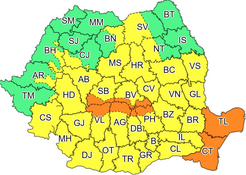 Codul galben avertizează că, în Dobrogea, în estul și nord-estul Munteniei și în jumătatea de sud a Moldovei va ploua însemnat cantitativ. În Oltenia, vestul Munteniei, cea mai mare parte a Transilvaniei, sudul Banatului, precum și în zonele de munte, vor fi perioade cu instabilitate atmosferică accentuată ce se va manifesta prin averse ce vor avea și caracter torențial, frecvente descărcări electrice, vijelii și, izolat, grindină.