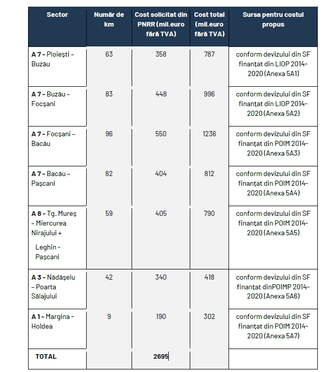 „Pentru a răspunde cât mai fidel cerințelor actuale în ceea ce privește rețeaua rutieră rapidă, proiectele de autostrăzi propuse pentru finanțare din PNRR vor îndeplini cumulat următoarele condiții incluse în documentația de achiziții publice, pentru execuția de lucrări: