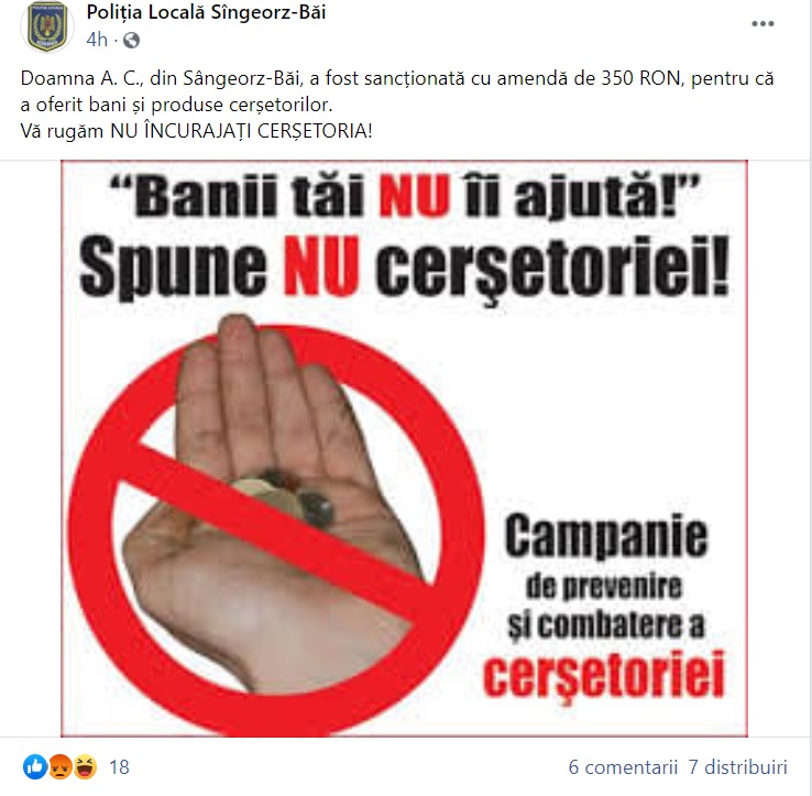 - „Doamna A. C., din Sângeorz-Băi, a fost sancționată cu amendă de 350 RON, pentru că a oferit bani și produse cerșetorilor” – este anunțul postat miercuri pe pagina de Facebook a Poliției Locale Sângeorz-Băi.