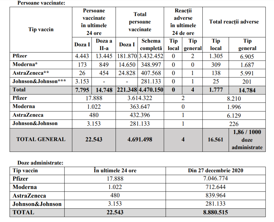În ultimele 24 de ore s-au ănregistrat 4 reacții adverse, 2 la Pfizer, una la AstraZeneca și una la Johnson&Johnson, în timp 124 de reacţii adverse sunt în curs de investigare.