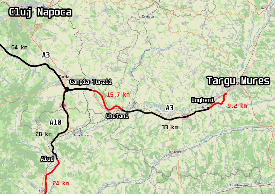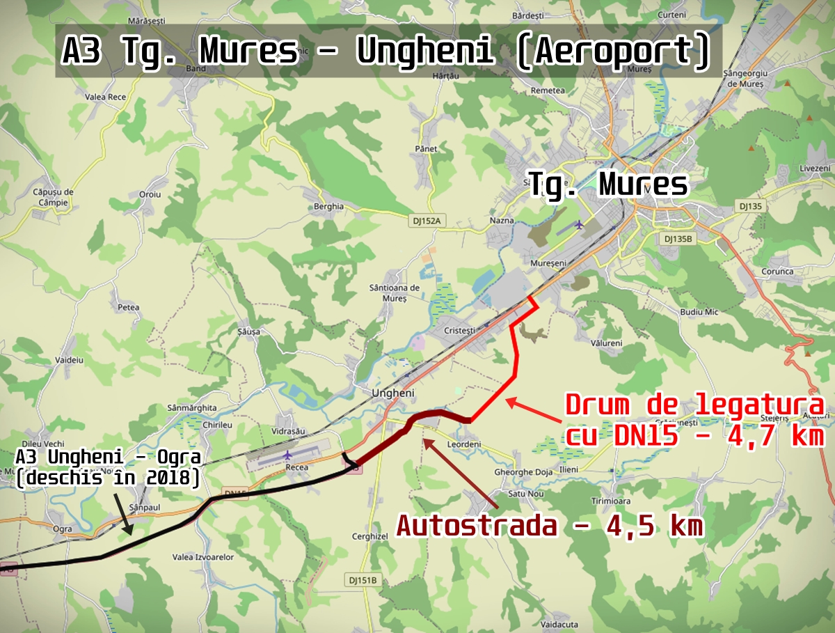 O bucată din autostrada A3 Transilvania ar urma să fie inaugurată anul acesta, deși teoretic termenul contractual este abia începutul anului viitor. Angajamentul a fost luat chiar de către ministrul Transporturilor, Cătălin Drulă, care a vizitat de curând șantierul unde constructorul austriac este bine mobilizat în teren. Tronsonul A3 de la Târgu Mureș la Ungheni (Aeroport) nu este unul lung, un „ciot” de doar puțin peste 9 km – 4,5 km de autostradă și 4,7 km de drum de legătură cu patru benzi – însă vine în continuarea a 33 de kilometri de autostradă deja dați în trafic și ar permite șoferilor să intre pe autostradă mult mai aproape de Târgu Mureș.