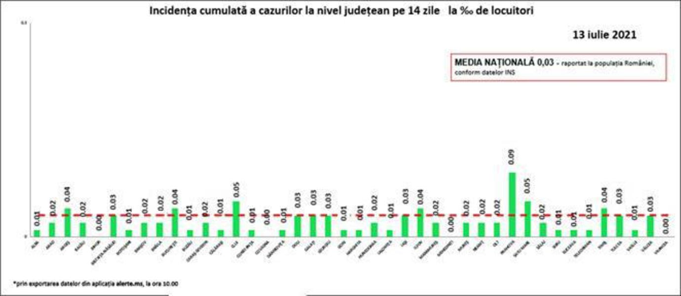 Rata de infectare este zero în patru dintre județele României, la nivel național indicele COVID-19 fiind de 0,03. Astfel în Bihor, Covasna, Mehedinți și Vrancea incidența cumulată a cazurilor la 14 zile este 0.