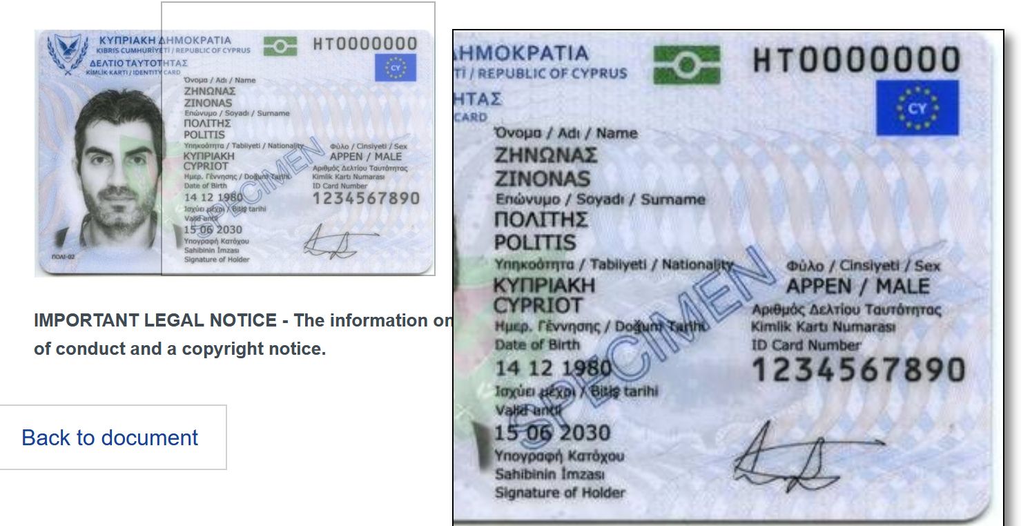 La Cipru, cel mai recent specimen de carte de identitate afișat apare ca fiind emis în data de 12 august 2020 și are termen de expirare 15 iunie 2030.