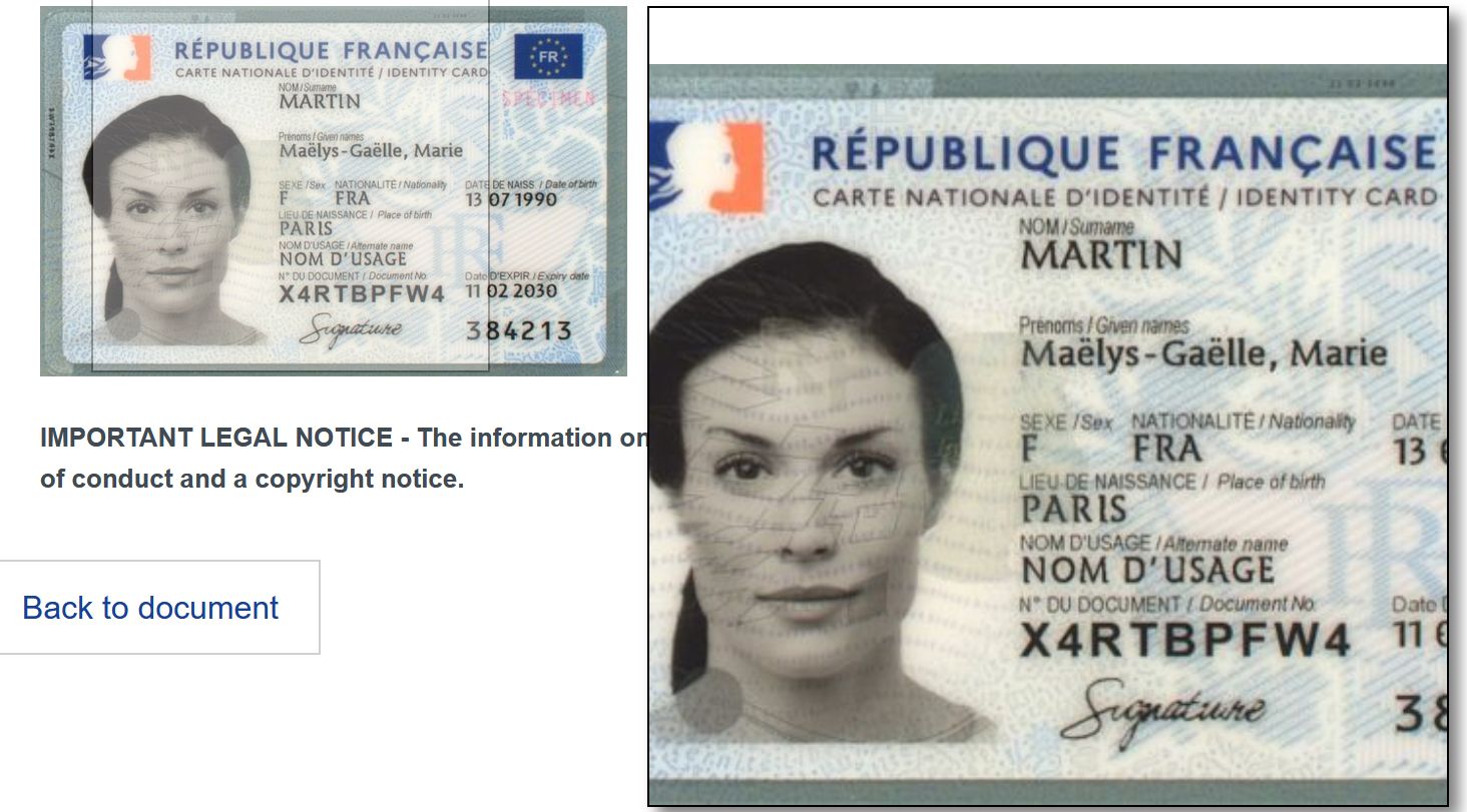 La Franța, cel mai recent specimen de carte de identitate afișat apare ca fiind emis în data de 15 martie 2021 și are termen de expirare 11 februarie 2030.