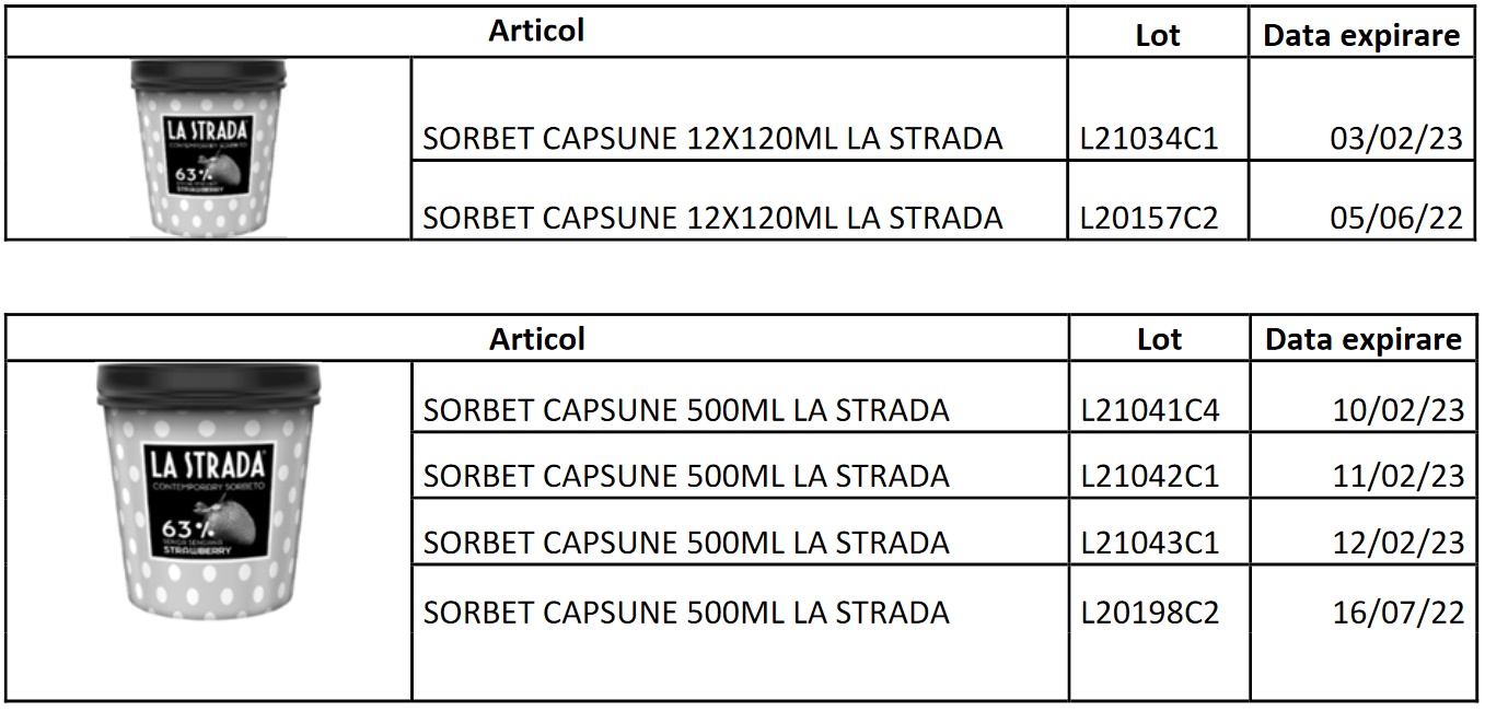 „Vă informăm că Macromex recheamă produsele de îngheţată «La Strada Căpşune». Compania Macromex, în calitate de proprietar al mărcii de îngheţată La Strada, produsă în Franţa, a fost informată de către unul din furnizorii săi cu privire la o problemă a stabilizatorilor de plante, al căror conţinut de oxid de etilenă depăşeşte limitele premise de reglementările în vigoare. Acest fapt are impact asupra anumitor produse La Strada. Stabilizatorii pe baza de plante folosiţi în producerea îngheţatei La Strada sunt folosiţi în cantităţi extrem de mici în produsele finite, astfel încât considerăm că nu prezintă un risc pentru sănătatea consumatorilor”, se arată în informarea emisă de Autoritatea Naţională Sanitar-Veterinară şi pentru Siguranţa Alimentelor (ANSVSA).