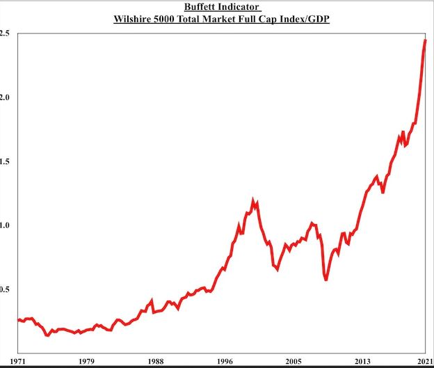 Ultimele estimări privind PIB-ul SUA în trimestrul doi îl plasează la 22,72 de trilioane de dolari, ceea ce înseamnă că indicele Buffett a ajuns la 205%, semnificativ peste nivelul de 187% înregistrat în al doilea trimestru din 2020 când pandemia făcea ravagii și PIB-ul american era cu 15% mai scăzut.