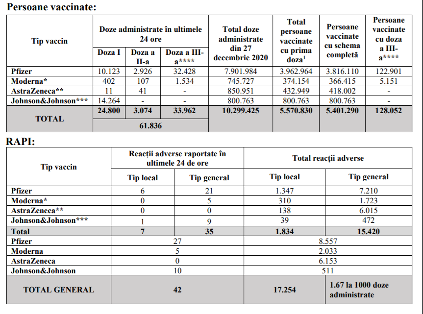 Numărul total al dozelor de vaccin administrate din 27 decembrie 2020, de la debutul campaniei de vaccinare, este de 10.299.425, dar numărul persoanelor vaccinate cu schemă completă este de 5.401.290, iar numărul persoanelor vaccinate cu doza 3 a ajuns la 128.052.