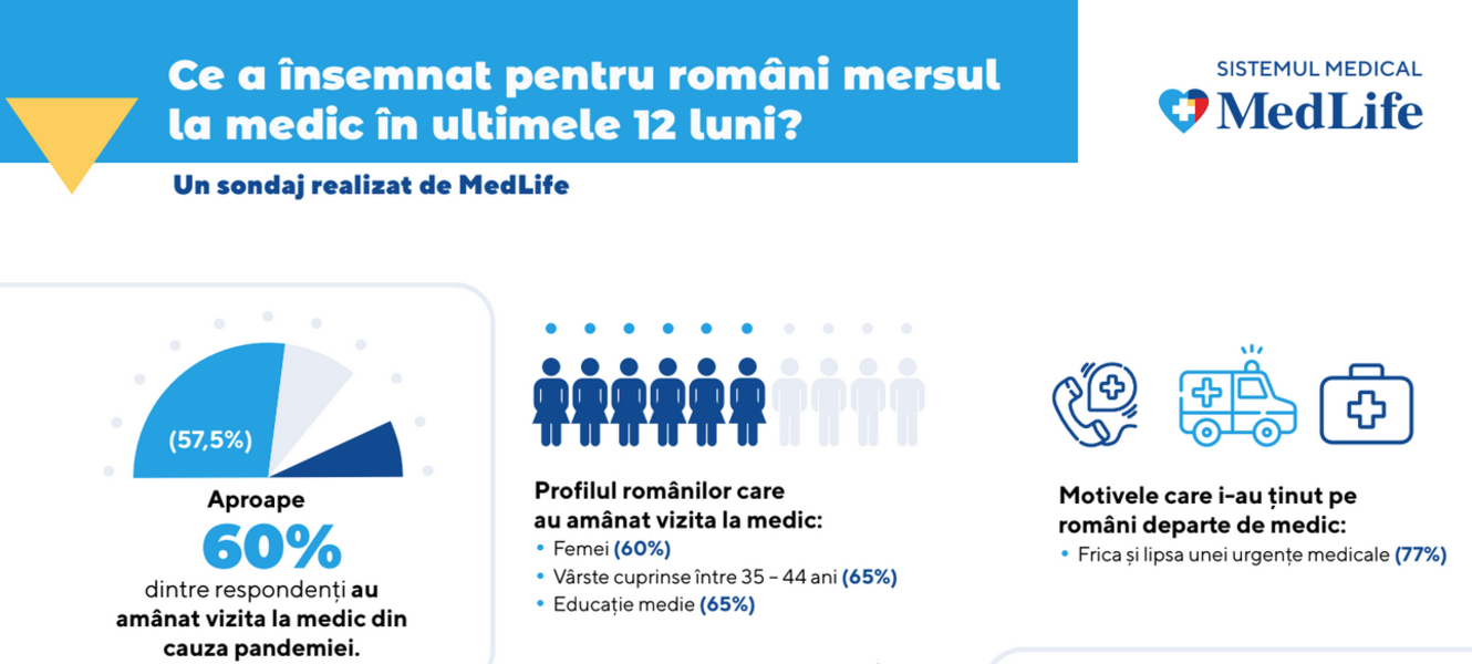 Contextul pandemic, însă, a schimbat comportamentele românilor în ceea ce privește vizitele la medic. Speriați de implicațiile și repercusiunile aduse de pandemie, mai mult de jumătate dintre respondenți au declarat că și-au amânat vizitele la medic în ultimele 12 luni. Profilul celor care au amânat să meargă la medic pe timpul pandemiei este conturat în special de femei (60%) cu vârste cuprinse între 35-44 de ani (65%) cu educație medie (65%).