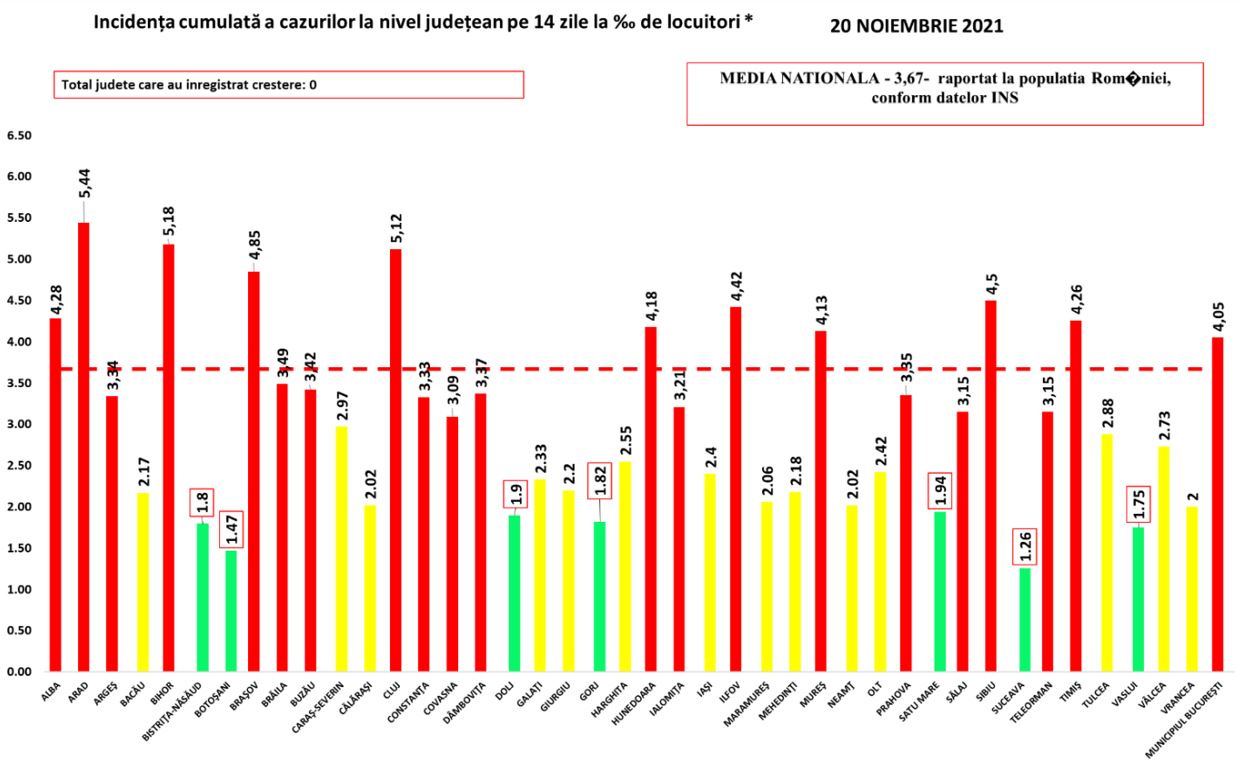 Cele mai mari incidențe sunt în județele Arad – 5,44 la mie, Bihor -5,18 și Cluj – 5,12. În București rata de infectare este de 4,05.