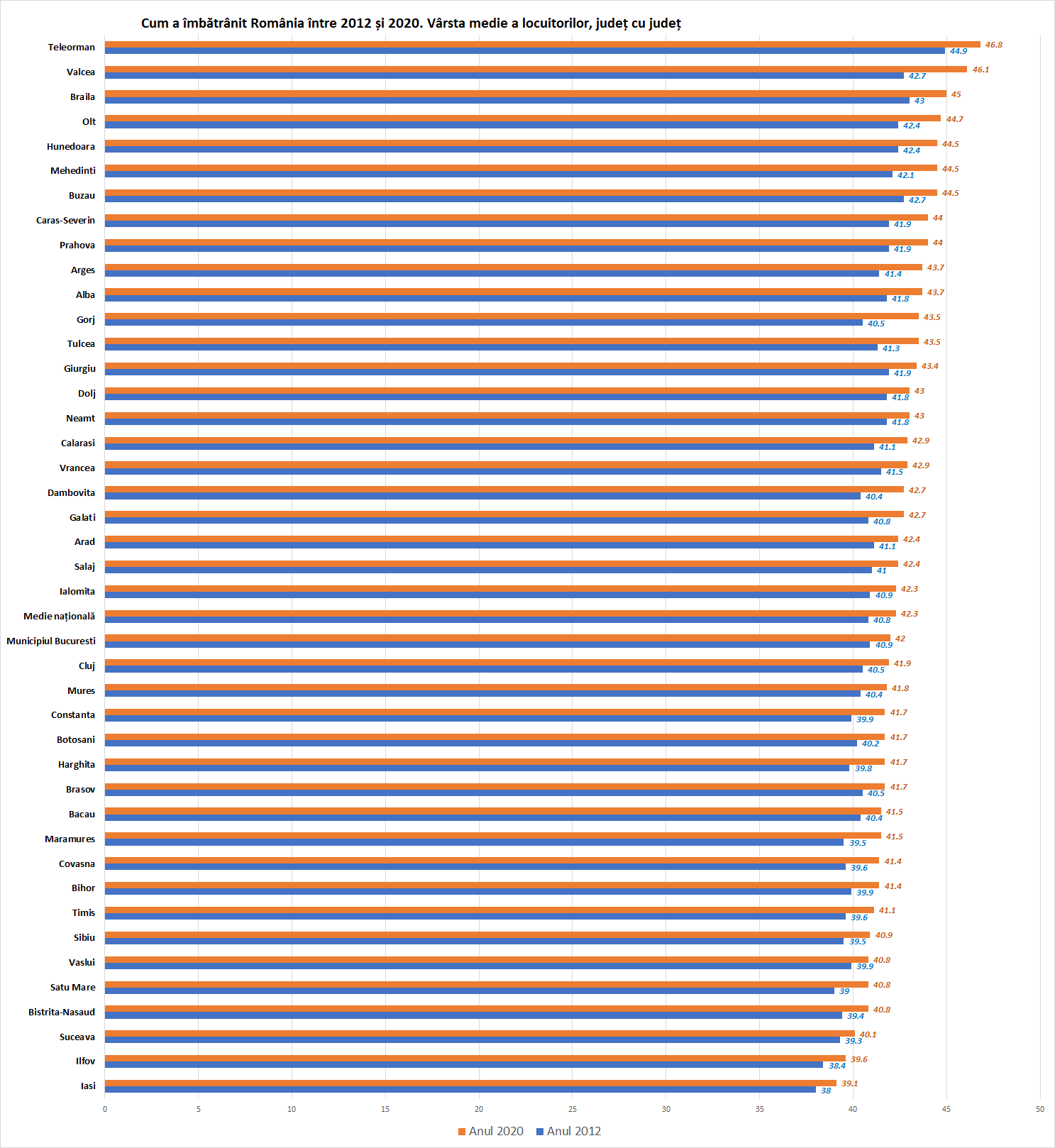 - Cele mai tinere județe: Iași, Ilfov, Suceava și Bistrița Năsăud, cu vârsta medie a locuitorilor în jurul a 40 de ani.