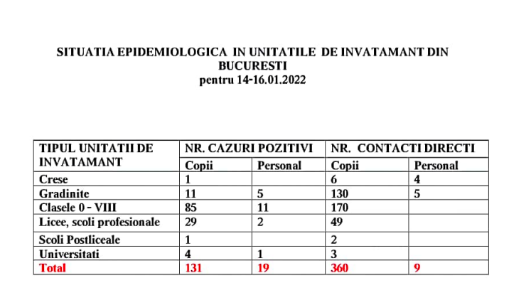 Potrivit raportărilor DSP București, 131 de preșcolari, elevi și studenți au fost confirmați cu Covid-19 între 14 și 16 ianuarie, precum și 19 angajați din unitățile de învățământ.