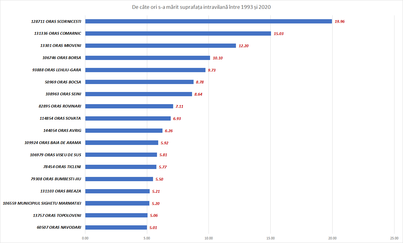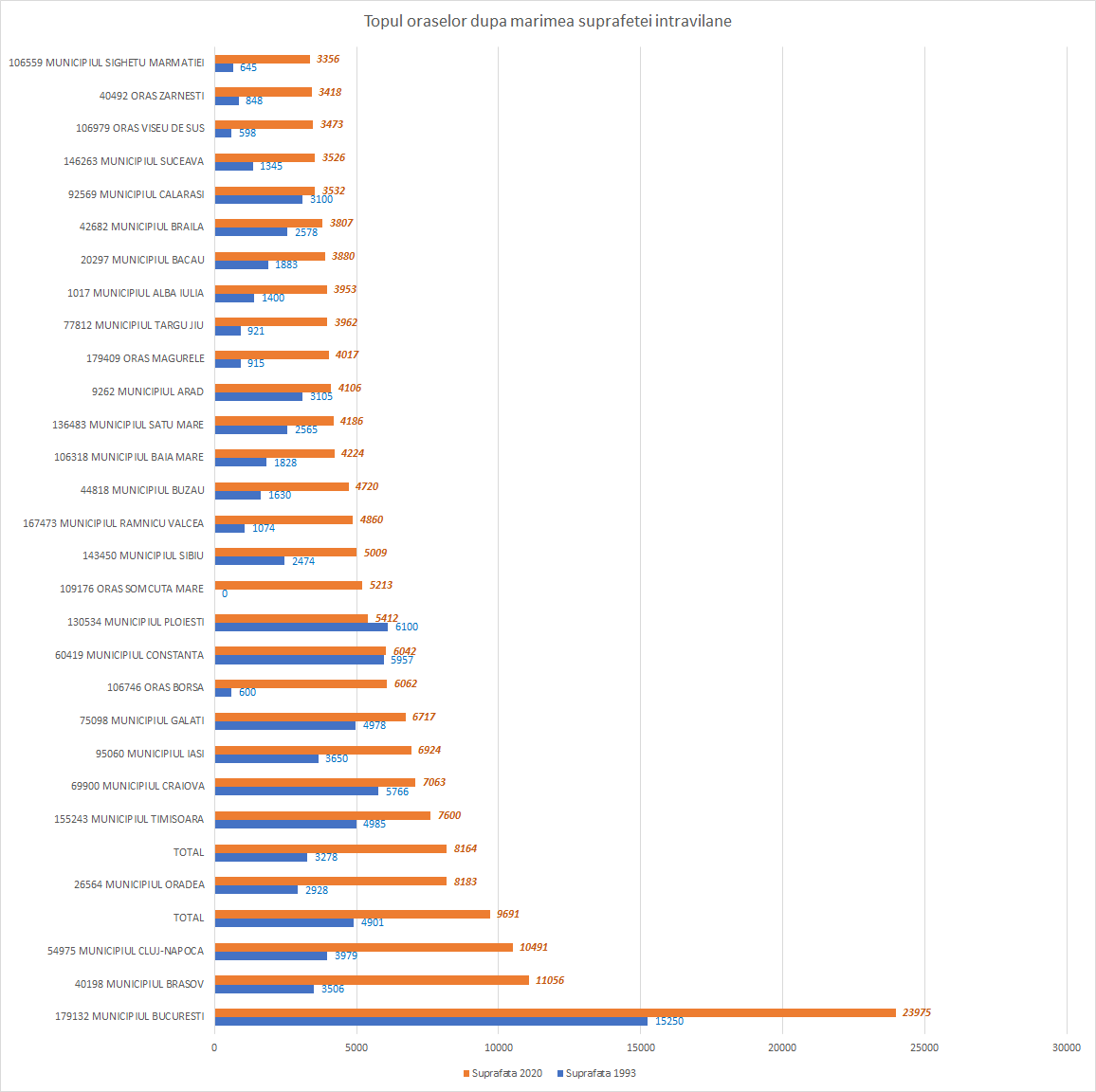 Mai jos, topul celor mai mari viteze de creștere a suprafețelor orașelor României (click pe imagine pentru a o mări)