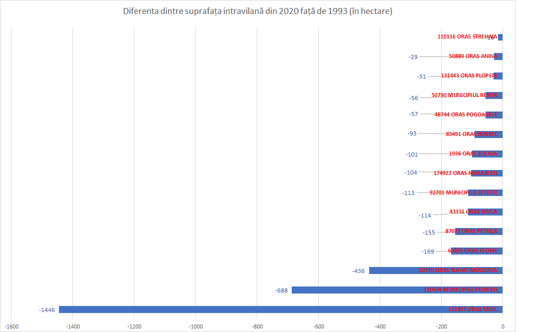 În ultimii 17 ani, municipiul București a adăugat la teritoriul său o suprafață mai mare decât suprafața Oradiei, arată datele INS, consultate de HotNews. Există de asemenea orașe care s-au ”contractat”, uneori cu peste 1000 de hectare, iar altele care și-au mărit teritoriul de aproape 20 de ori. De ce ”cresc” sau ”scad” suprafețele orașelor? Explicațiile sunt multe: de la presiunile făcute de dezvoltatori pentru includerea unor terenuri în perimetrul intravilan, la dezvoltarea industrială intensivă. În cazul orașelor care au înregistrat un recul, e vorba de dez-industrializare, de plecarea localnicilor la muncă în străinătate sau de îmbătrânirea populației.