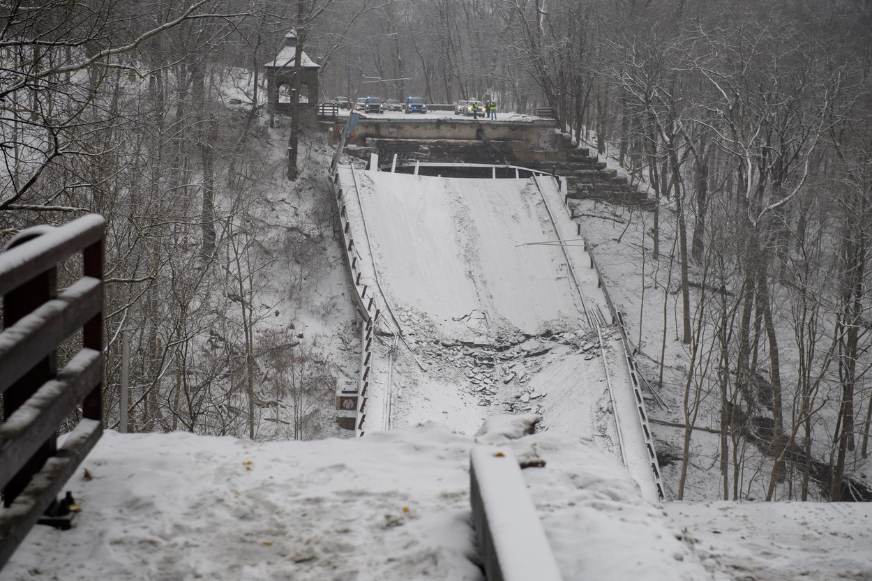 Zece persoane au suferit răni uşoare atunci când o secţiune a podului plin de zăpadă s-a prăbuşit într-o vale împădurită, au explicat autorităţile locale, conform cărora la momentul incidentului în zonă era raportată o scurgere masivă de gaz.
