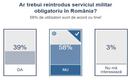Un sondaj TVR și HotNews recent indică faptul că opinia publică din România nu este confortabilă cu ideea de a se reveni la stagiul militar obligatoriu. Nici nu îmi dau seama cum ar putea fi el pus în practică; nici măcar Israelul nu reușește să aducă sub arme – și au exercițiu în domeniu, nu glumă – toți cetățenii care ar trebui să urmeze stagiul militar obligatoriu.