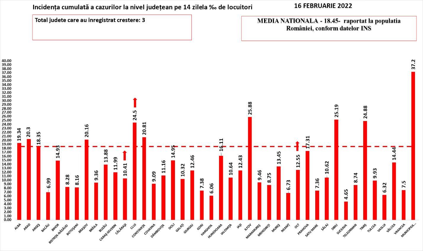 Rata de infectare COVID-19, în fiecare județ, 16 februarie