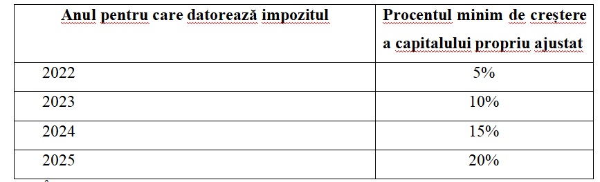 • 3%, dacă înregistrează o creștere peste nivelul prevăzut mai jos (*tabelul de mai jos) a capitalului propriu ajustat al anului pentru care datorează impozitul față de capitalul propriu ajustat înregistrat în anul 2020 și dacă îndeplinește concomitent condiția prevăzută la primul punct. Prevederile se aplică începând cu anul 2022, respectiv începând cu anul fiscal modificat care începe în anul 2022.
