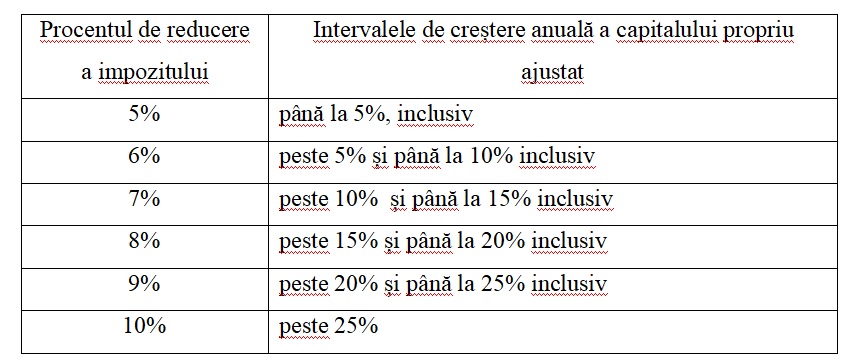 • dacă înregistrează o creștere anuală a capitalului propriu ajustat al anului pentru care datorează impozitul față de capitalul propriu ajustat înregistrat în anul precedent și îndeplinește concomitent condiția prevăzută mai sus, reducerile au următoarele valori: