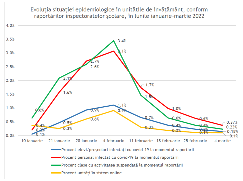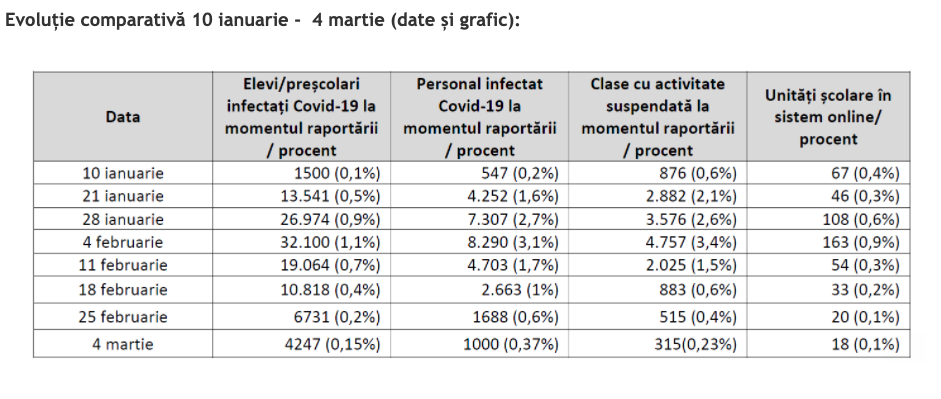 GRAFIC Bilanțul cazurilor de COVID în școli continuă să scadă: 4200 de elevi și preșcolari infectați