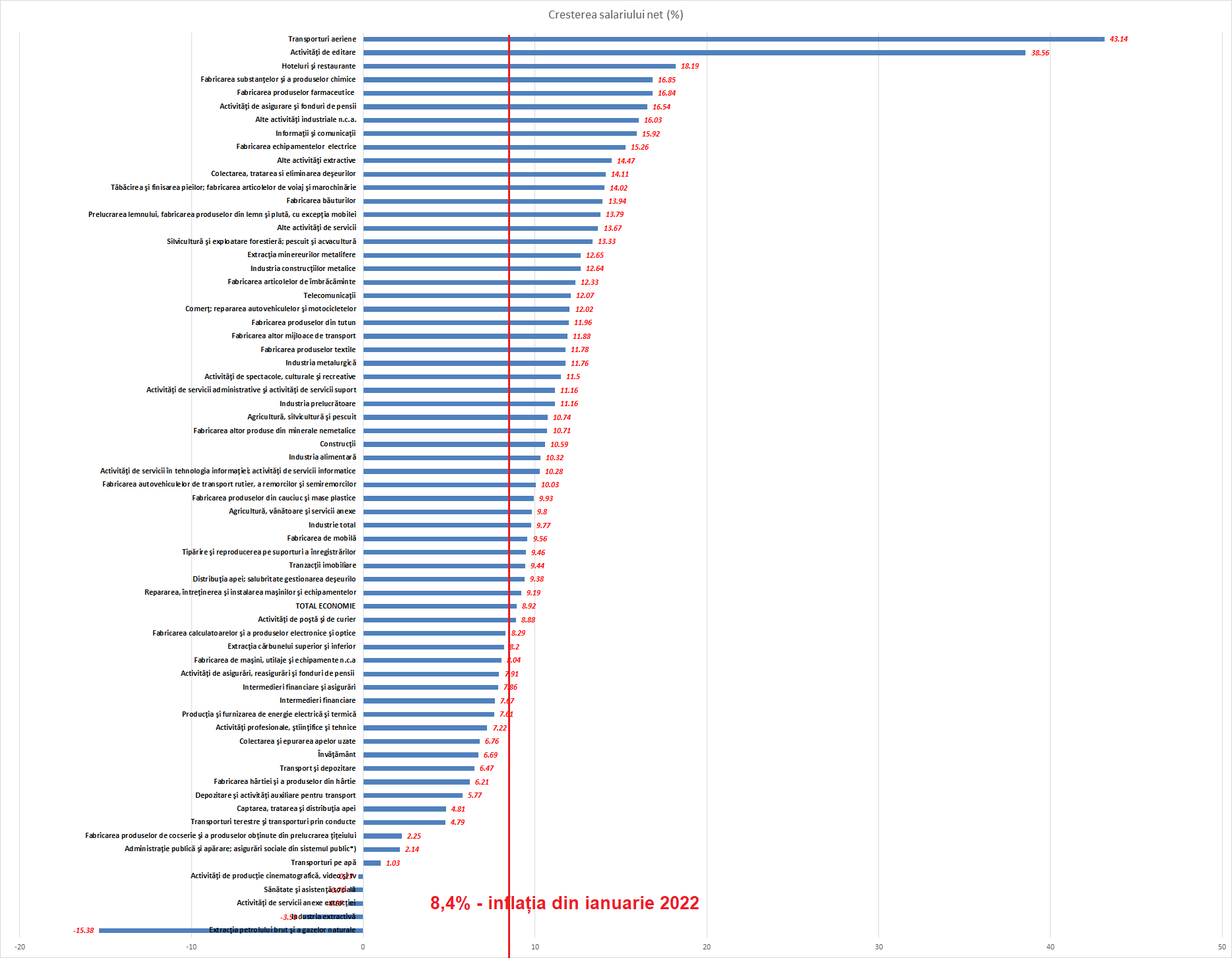 În luna ianuarie 2022, în majoritatea activităţilor din sectorul economic , nivelul câştigului salarial mediu net a scăzut faţă de luna precedentă, ca urmare a acordării în luna decembrie 2021 de prime ocazionale (prime trimestriale, anuale, pentru sărbătorile de iarnă, pentru performanțe deosebite sau al 13-lea salariu), drepturi în natură şi ajutoare băneşti, sume din profitul net şi alte fonduri (inclusiv bilete de valoare). De asemenea, câştigurile salariale medii nete din luna ianuarie au fost mai mici comparativ cu luna precedentă ca urmare a nerealizărilor de producţie ori încasărilor mai mici (funcţie de contracte/proiecte), cât şi a angajărilor de personal cu câştiguri salariale mai mici faţă de medie, din unele activităţi economice.