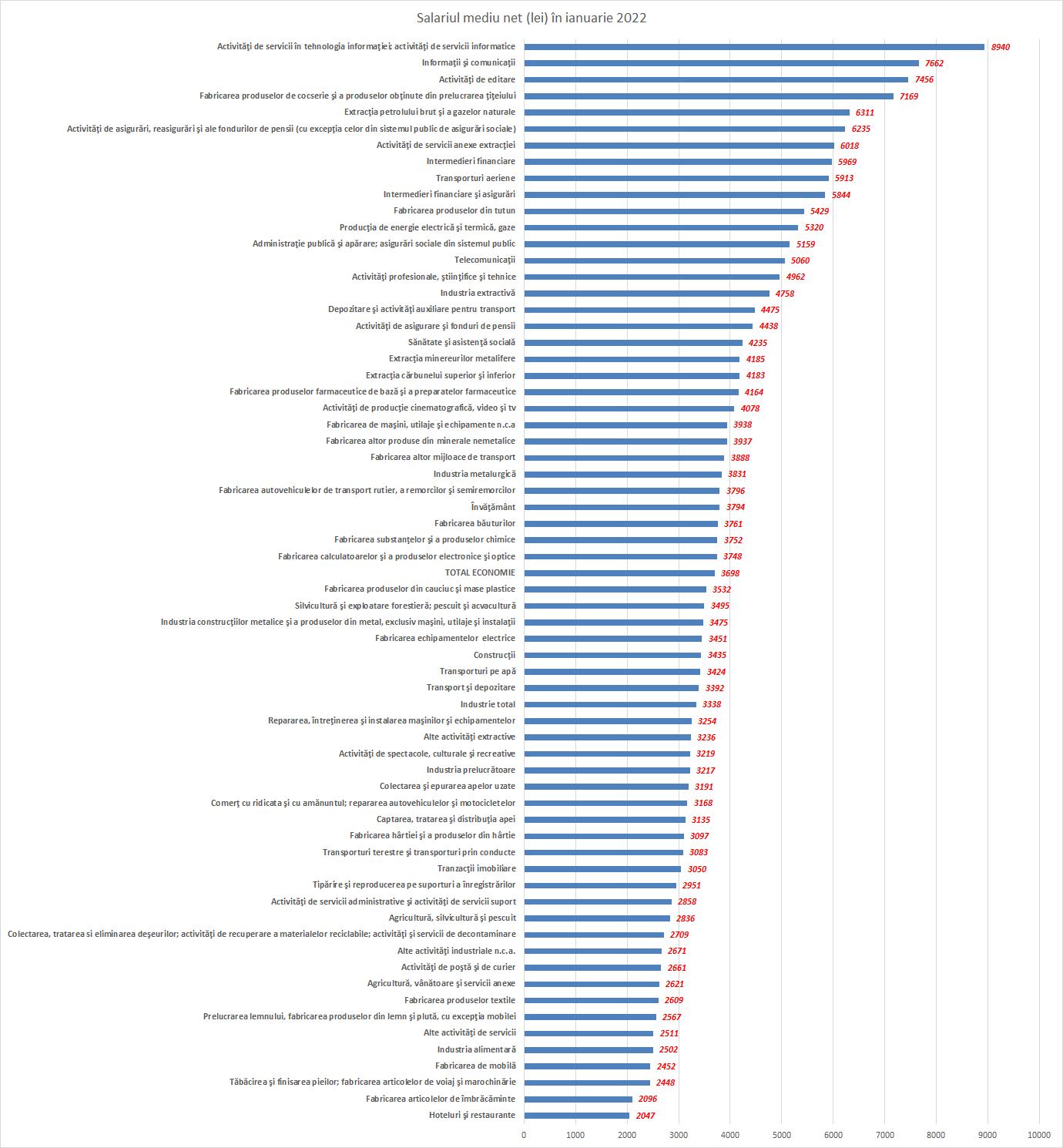 - Valorile cele mai mari ale salariului net s-au înregistrat în activităţi de servicii în tehnologia informaţiei (inclusiv activităţi de servicii informatice) (8940 lei), iar cele mai mici în hoteluri şi restaurante (2047 lei).