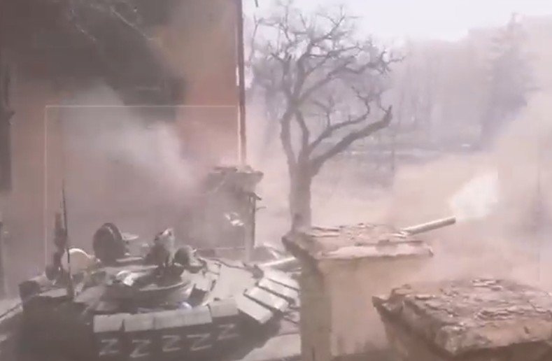 Înregistrări ale tancurilor rusești care se plimbă pe străzile unui oraș deja devastat, trăgând deliberat în blocuri ar fi fost publicate de Russia Today. Abia spre finalul înregistrării apare un schimb de focuri, ca semn că în clădiri s-ar afla apărători ai orașului.