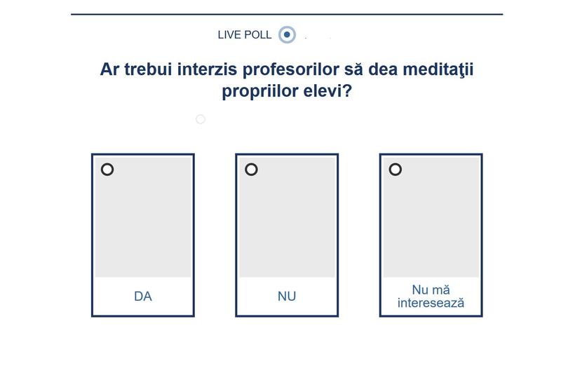 Elevii claselor terminale de gimnaziu şi liceu sunt pe ultima sută de metri a pregătirilor pentru Evaluarea Naţională şi Bacalaureat. În cazul multora dintre ei, febra examenelor înseamnă… meditaţii particulare la turaţie maximă. Sondajele arată că unul din trei copii români este cuprins în sistemul meditaţiilor, devenit practic o „şcoală paralelă”, care ia tot mai mare amploare. Autorităţile încearcă acum să controleze fenomenul, prin soluţii diverse. Ministerul Educaţiei vrea ca legea să-i sancţioneze pe profesorii care dau meditaţii elevilor de la clasele unde predau. Iar Fiscul le cere meditatorilor să aibă casă de marcat pentru a-şi înregistra sumele primite. Subiectul este comentat de Mihai Rădulescu şi invitaţii săi la „Referendum”, luni, 30 mai, de la ora 21.00, în direct la TVR 1.