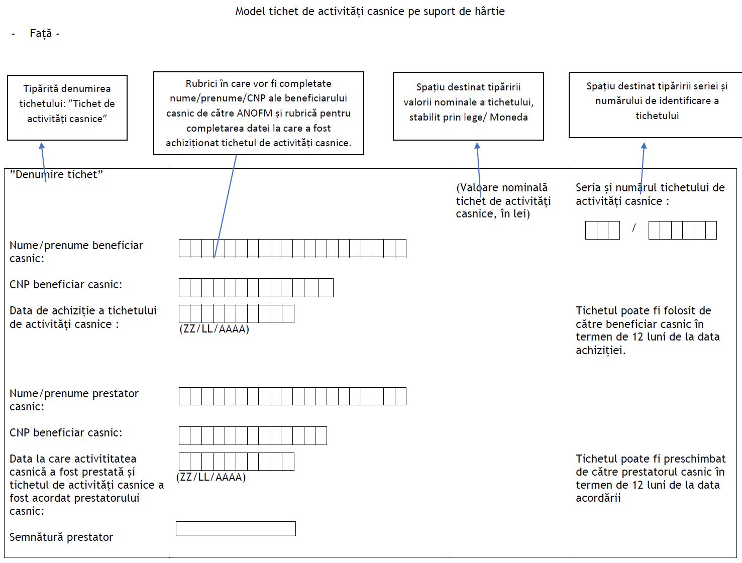 Tichetul de activităţi casnice va conține rubrici speciale destinate informațiilor referitoare la identificarea beneficiarului și a prestatorului casnic, date referitoare la valabilitatea tichetului, precum şi elemente de siguranță obligatorii. Formatul propus de normele metodologice pentru tichetele în format fizic va fi avut în vedere la încheierea contractului de tipărire.