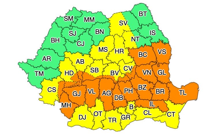 Tot miercuri, în intervalul 14:00 – 22:00 va fi în vigoare o avertizare cod portocaliu pentru jumătatea de sud a Moldovei, nordul și estul Munteniei și nordul Dobrogei.