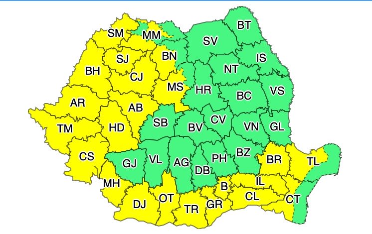 Astfel, miercuri, de la ora 12:00 și până joi, la ora 02:00, va fi în vigoare o avertizare cod galben de instabilitate atmosferică.