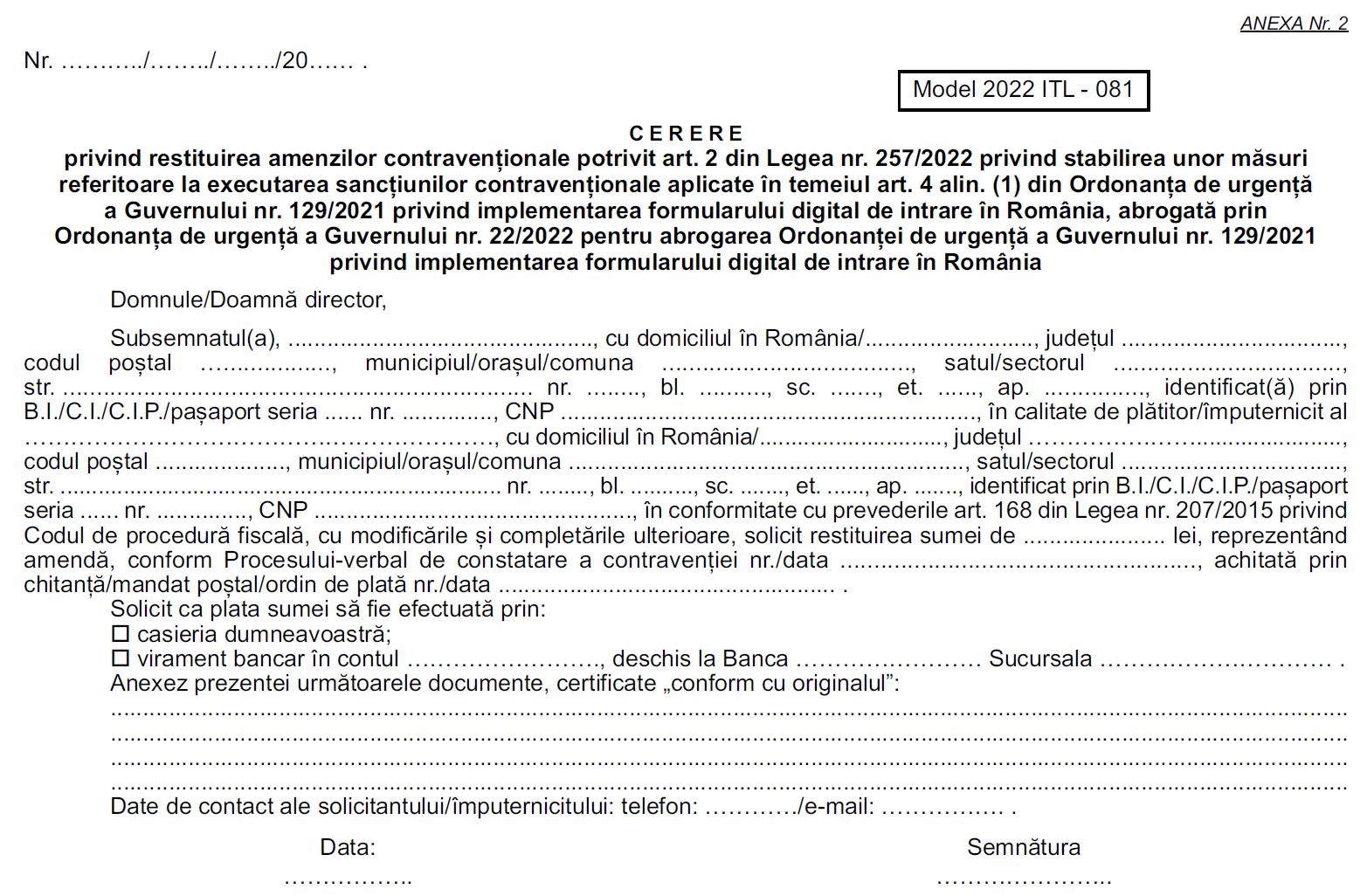Românii care au plătit amenzi, în pandemie, pentru necompletarea formularului digital de intrare în România (PLF) vor putea, începând de astăzi, să depună o cerere pentru restituirea banilor la organul fiscal local unde au domiciliul. Procedura și cererea de restituire a banilor au fost stabilite prin ordin al ministrului Dezvoltării, publicat marți în Monitorul Oficial.