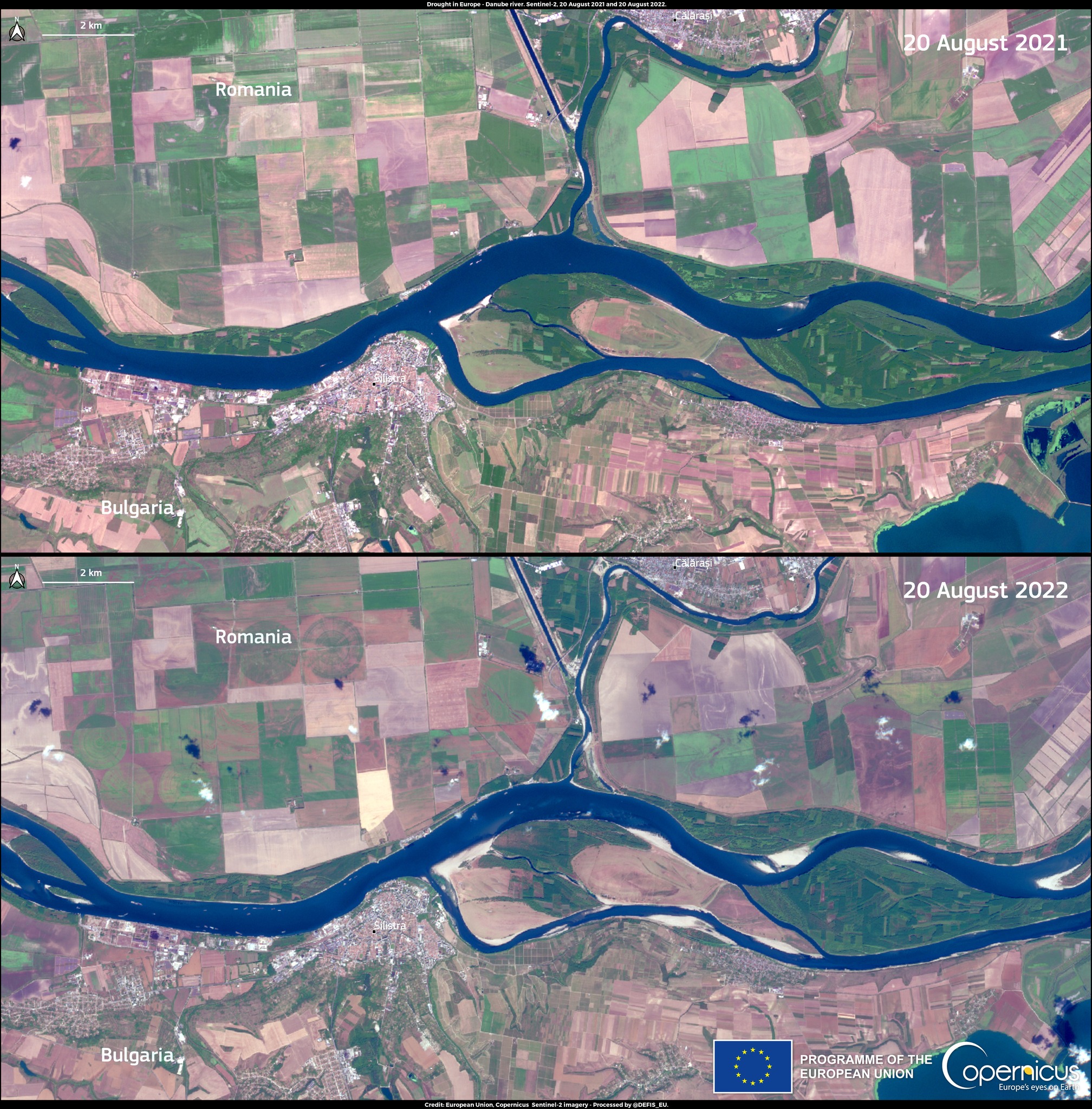 Reprezentanța Comisiei Europene în România a publicat marți, pe Facebook, imagini surprinse de sateliții Copernicus EU în 20 august 2021 și 20 august 2022, cu Dunărea la granița dintre România și Bulgaria.