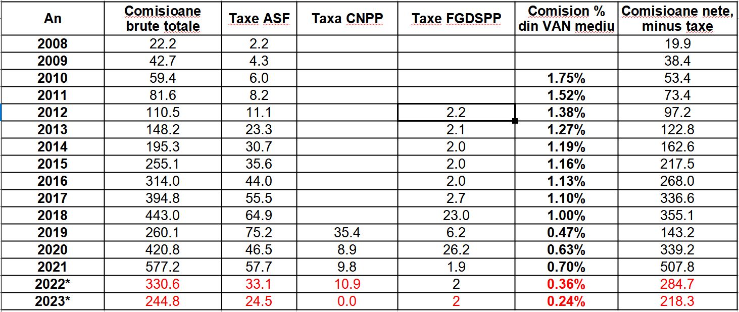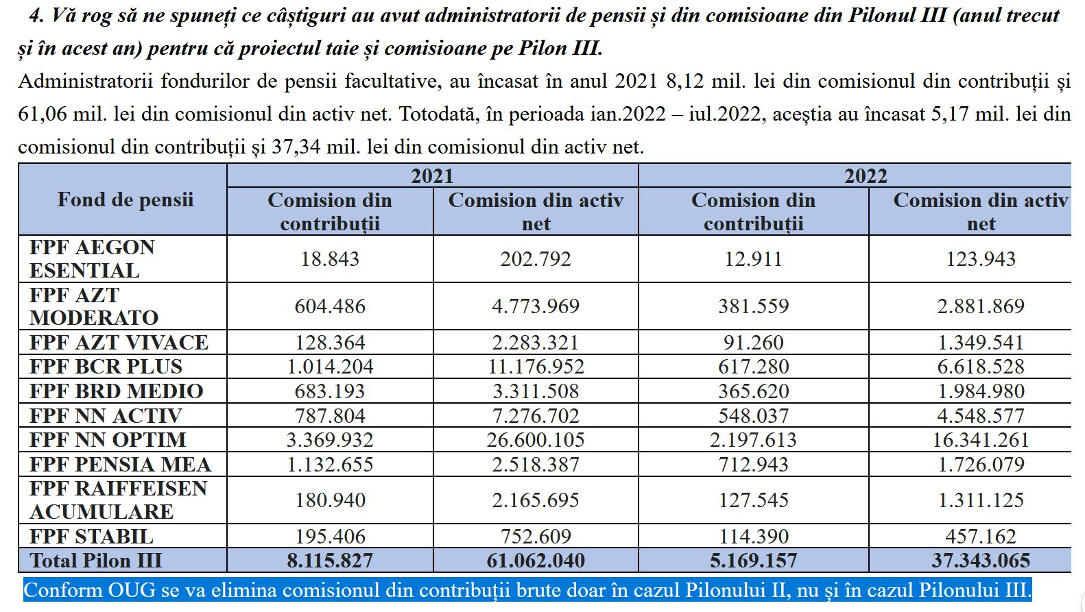 Totodată, în perioada ianuarie 2022 – iulie 2022, aceștia au încasat 5,17 milioane lei din comisionul din contribuții și 37,34 milioane lei din comisionul din activ net.