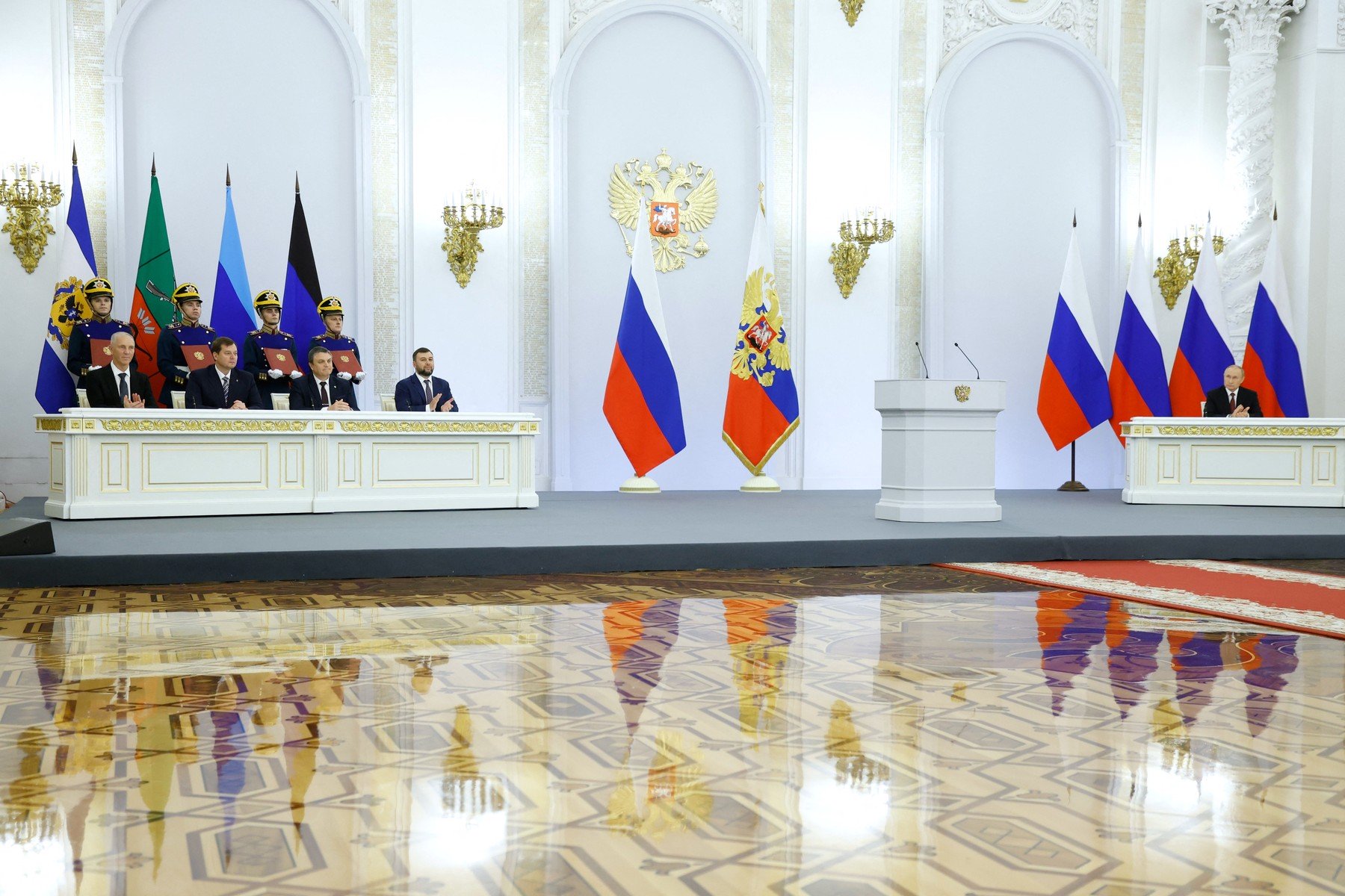 VIDEO Zâmbete, litera Z și bucurie la Kremlin. Putin a scandat „Rusia” alături de cei patru lideri ruși din regiunile nou anexate, în timp ce continuă să împartă moarte
