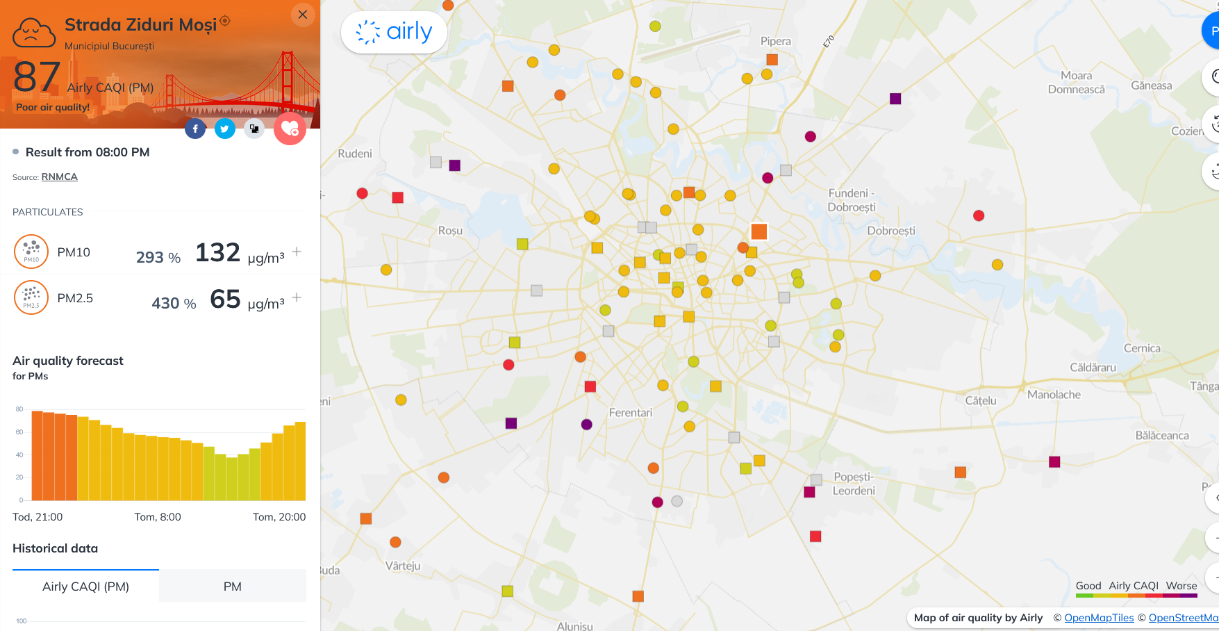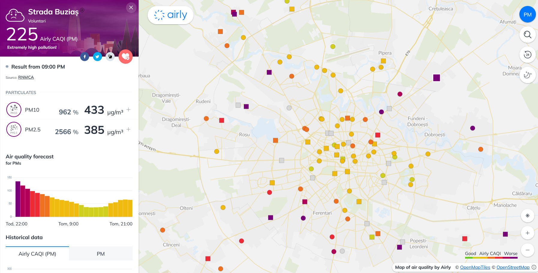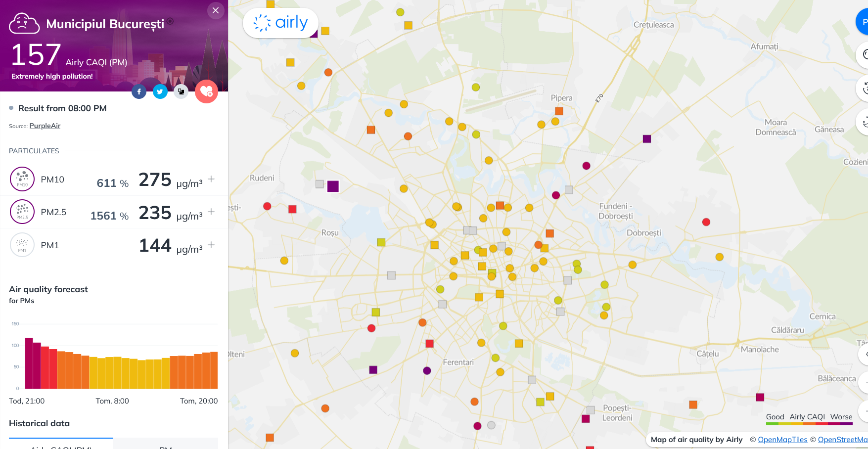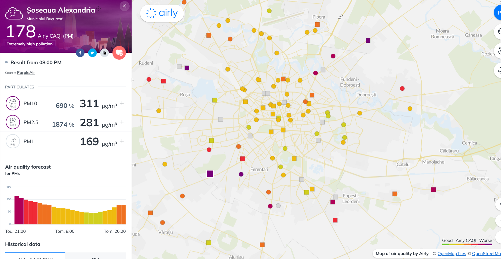 Poluare extremă sâmbătă seară în București. Pentru particulele PM 2,5, rețeaua independentă de monitorizare a calității aerului – Airly.org – a înregistrat, în anumite zone din București și din localitățile învecinate, valori instant de 25 de ori mai mari față de valorile recomandate de Organizația Mondială a Sănătății pentru media zilnică. Aceste zone au fost marcate pe hartă cu culoarea violet și indicativul de poluare extremă.