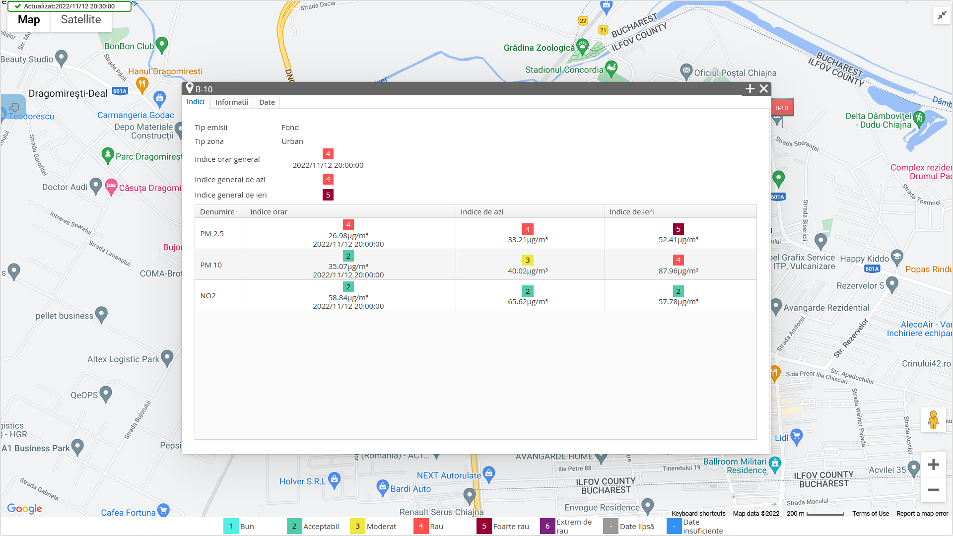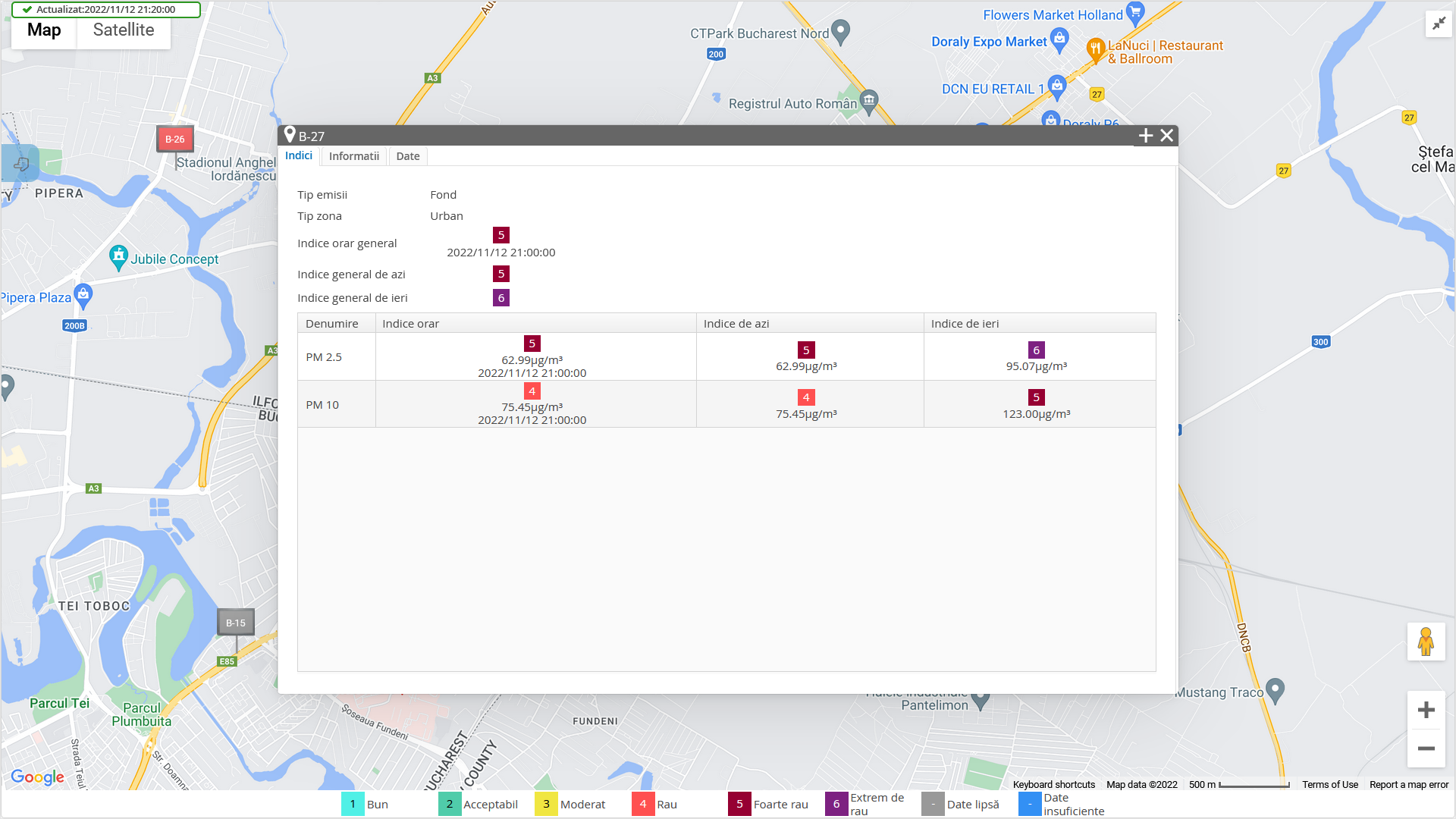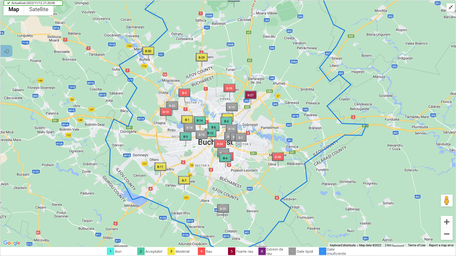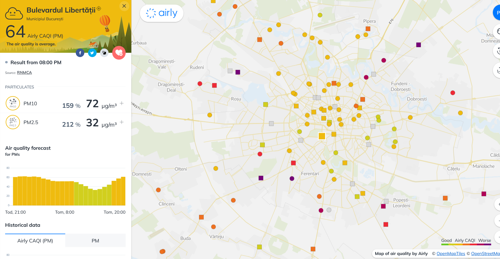 Poluare extremă sâmbătă seară în București. Pentru particulele PM 2,5, rețeaua independentă de monitorizare a calității aerului – Airly.org – a înregistrat, în anumite zone din București și din localitățile învecinate, valori instant de 25 de ori mai mari față de valorile recomandate de Organizația Mondială a Sănătății pentru media zilnică. Aceste zone au fost marcate pe hartă cu culoarea violet și indicativul de poluare extremă.