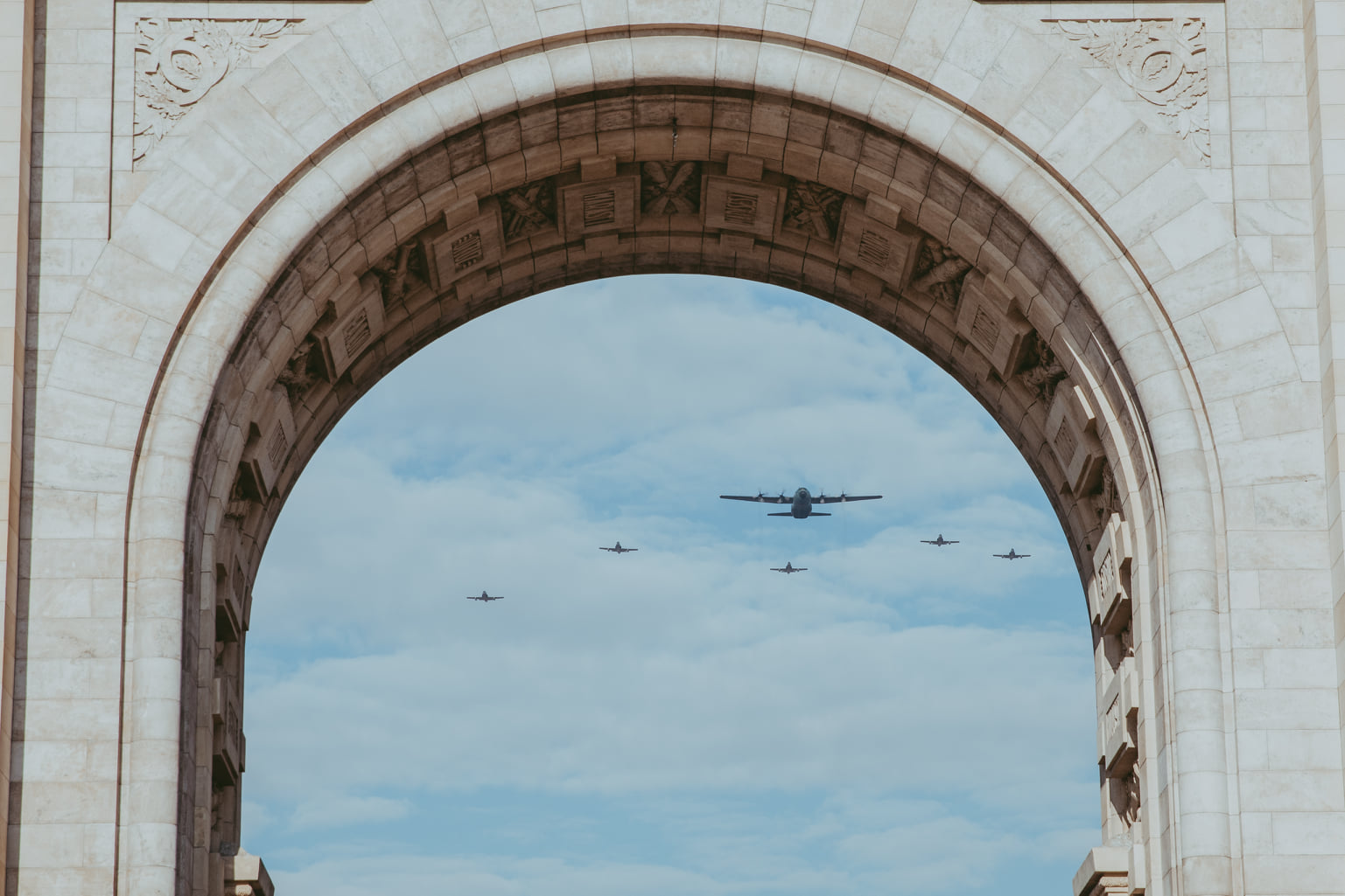 - Dispozitivul de zbor este deschis de o formație de aeronave C-27J SPARTAN din dotarea Bazei 90 Transport Aerian Otopeni, patru aeronave care trec câte două deasupra Arcului de Triumf.