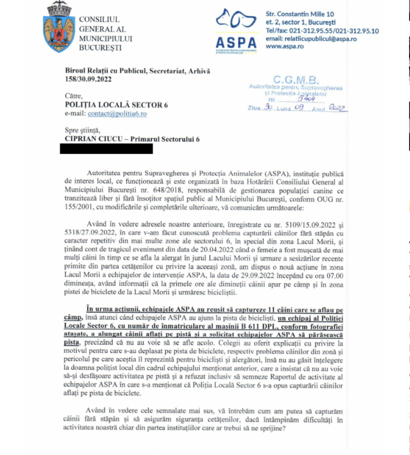 Într-o adresă datată 30.09.2022, către Poliția Locală Sector 6 și primarul Ciprian Ciucu, ASPA spune că în urma incidentului din aprilie, când Ana Oros Daraban a fost atacată de o haită de câini și având în vedere și sesizările ulterioare ale oamenilor din zonă, a fost dispusă o nouă acțiune a echipajelor ASPA.
