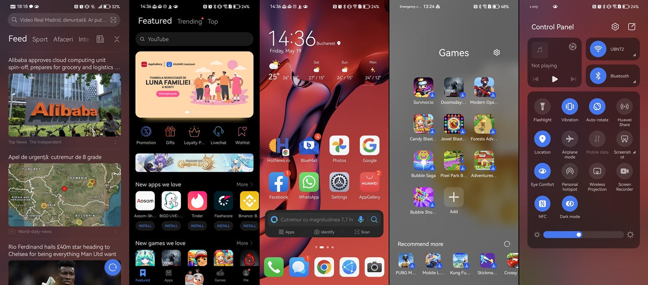 De exemplu, în ecranul cel mai din stânga, în locul celebrului Google Discover, Huawei a pus un feed în care livrează și știri, și alte chestiuni utilitare (numărul de pași, vremea, calendarul, timpii de utilizare a aplicațiilor).