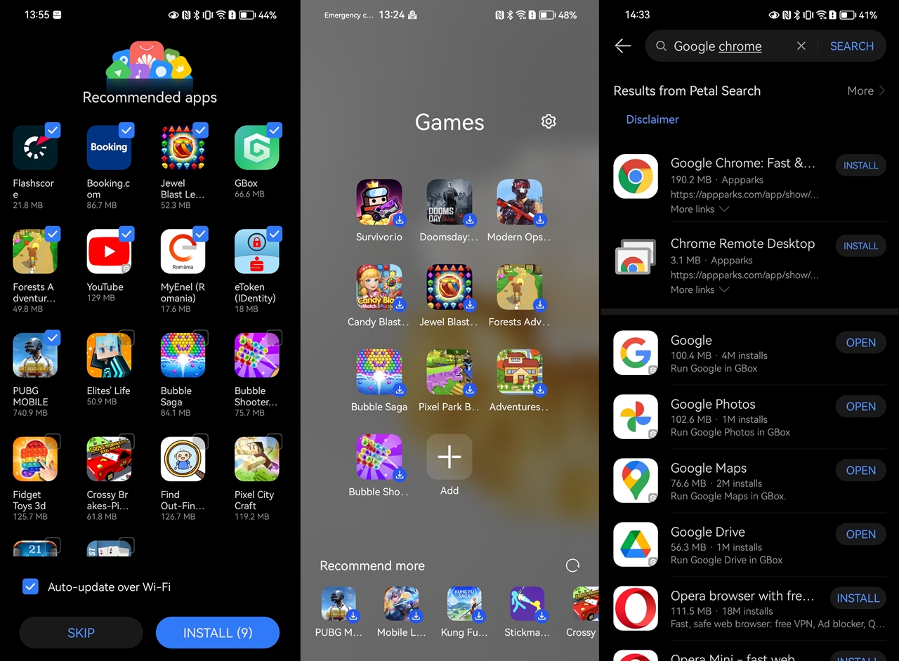 > La prima deschidere telefonul vine cu două ecrane pline de aplicații și foldere de aplicații, inclusiv aplicații care nu sunt instalate, dar care îți sunt „sugerate”. De exemplu, telefonul venea cu un folder de jocuri sugerate pentru a fi descărcate. Este și cazul altor aplicații, precum Flashscore, Autodoc, Booking, Alibaba, Binance, Outlook, care nu erau descărcate, ci doar prezente ca scurtături pentru descărcare, ocupând practic spațiu pe homescreen și în folderele autocreate. Similar, sugestii cu aplicații și programe pentru descărcare primești și la prima intrare în App Gallery.