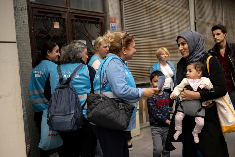Susținătoare ale lui Kemal Kilicdaroglu, contracandidatul lui Erdogan în alegeri, împart fluturași la IstanbulFoto: Yasin AKGUL / AFP / Profimedia