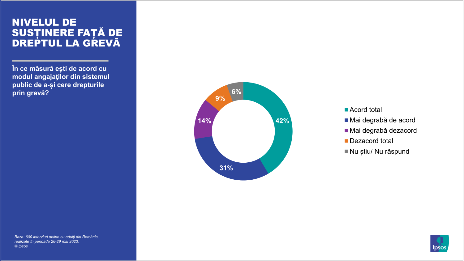 73% dintre români susțin modul angajaților din sistemul public de a-și cere drepturile prin grevă. Nivelul de susținere din partea societății este ridicat, iar opinia este similar împărtașită de femei și de bărbați, în toate regiunile țării, nediferențiat pe nivelul de educație, venit sau sfera profesională în care activează.