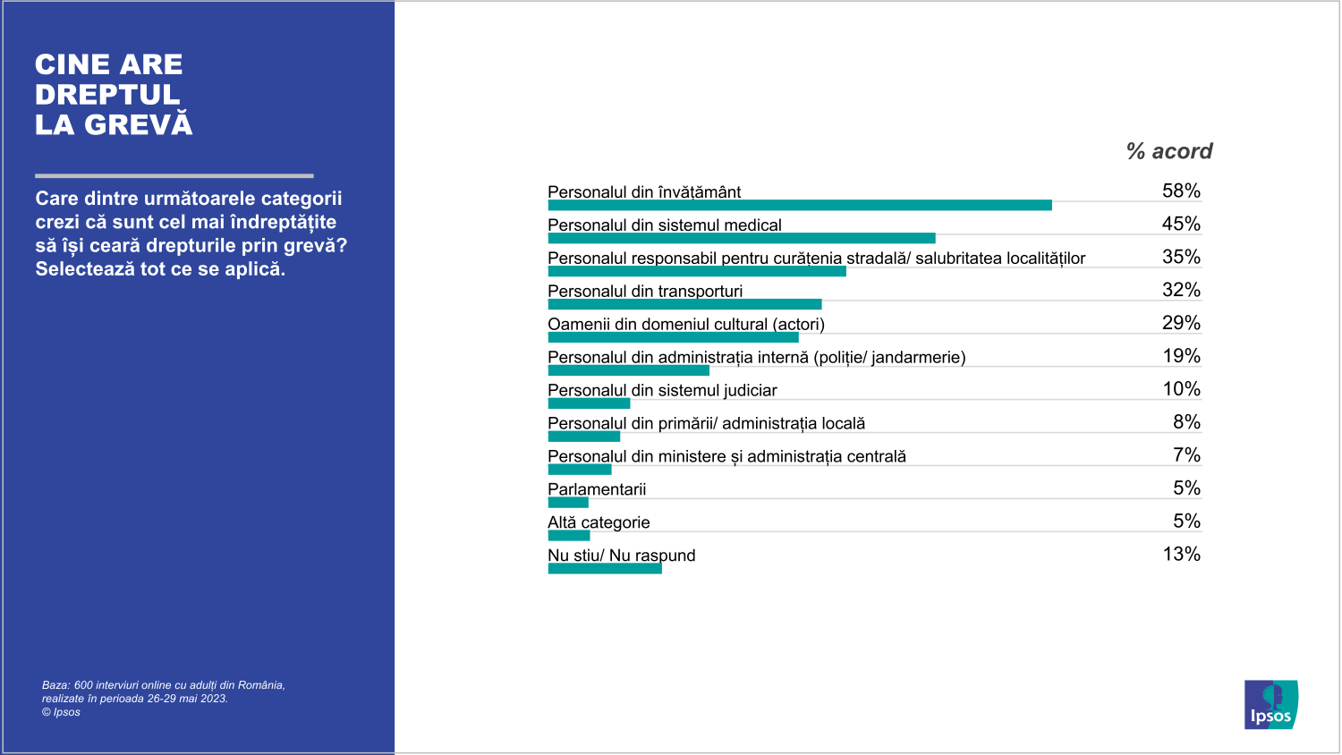 Personalul din domeniul medical, urmat de cel din salubritate și transporturi se bucură de o opinie favorabilă din partea românilor în ceea ce privește solicitarea drepturilor prin grevă. La polul opus sunt mentionați parlamentarii, dar și personalul din ministere, administrațiile centrale și locale
