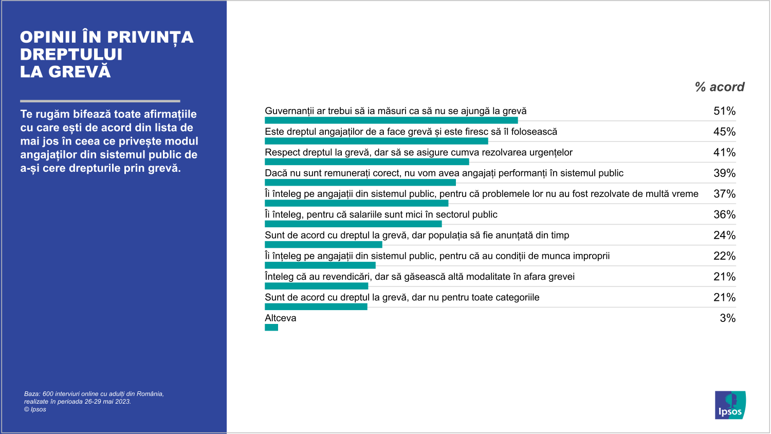 Dreptul la grevă este respectat iar românii îl găsesc justificat din mai multe perspective: viziunea că, dacă nu sunt remunerați corect, nu vom avea angajați performanți în sistemul public, problemele nerezolvate de mult timp în sistem, nivelul redus de salarizare în sectorul public, respectiv condițiile de muncă improprii.