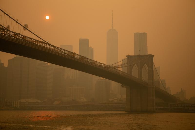 La New York, Statuia Libertăţii şi zgârie-norii din Manhattan sunt învăluiţi într-o ceaţă portocaliu-maronie, iar măştile – vestigiile pandemiei Covid-19 – şi-au făcut reapariţia în stradă.