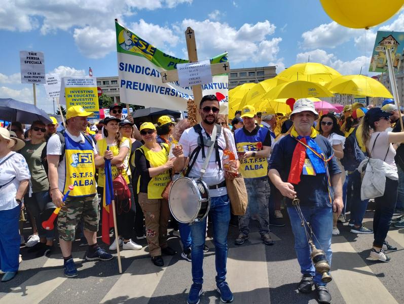 Peste 10.000 de cadre didactice au protestat în 25 mai în centrul Capitalei, inițial în Piața Victoriei, de unde au mers în marș până la Parlament, în cea de a patra zi a grevei generale. În 30 mai, au ieșit în stradă peste 20.000 de angajați din învățământ, mulți dintre ei venind cu autocarele din alte județe. După ce au protestat în fața Guvernului, profesorii au plecat în marș până la Palatul Cotroceni: „Nu cedăm, ghinion!”.
