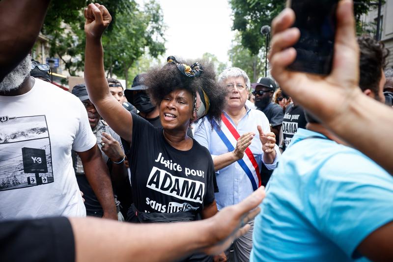 Assa Traoré, sora lui Adama, care a devenit o figură în lupta împotriva violenței polițienești de la moartea acestuia, a vorbit pe o bancă din Place de la République în fața mai multor aleși ai partidului opoziție Franța Nesupusă (stânga radicală) și înconjurată de o mare forță de aplicare a legii.