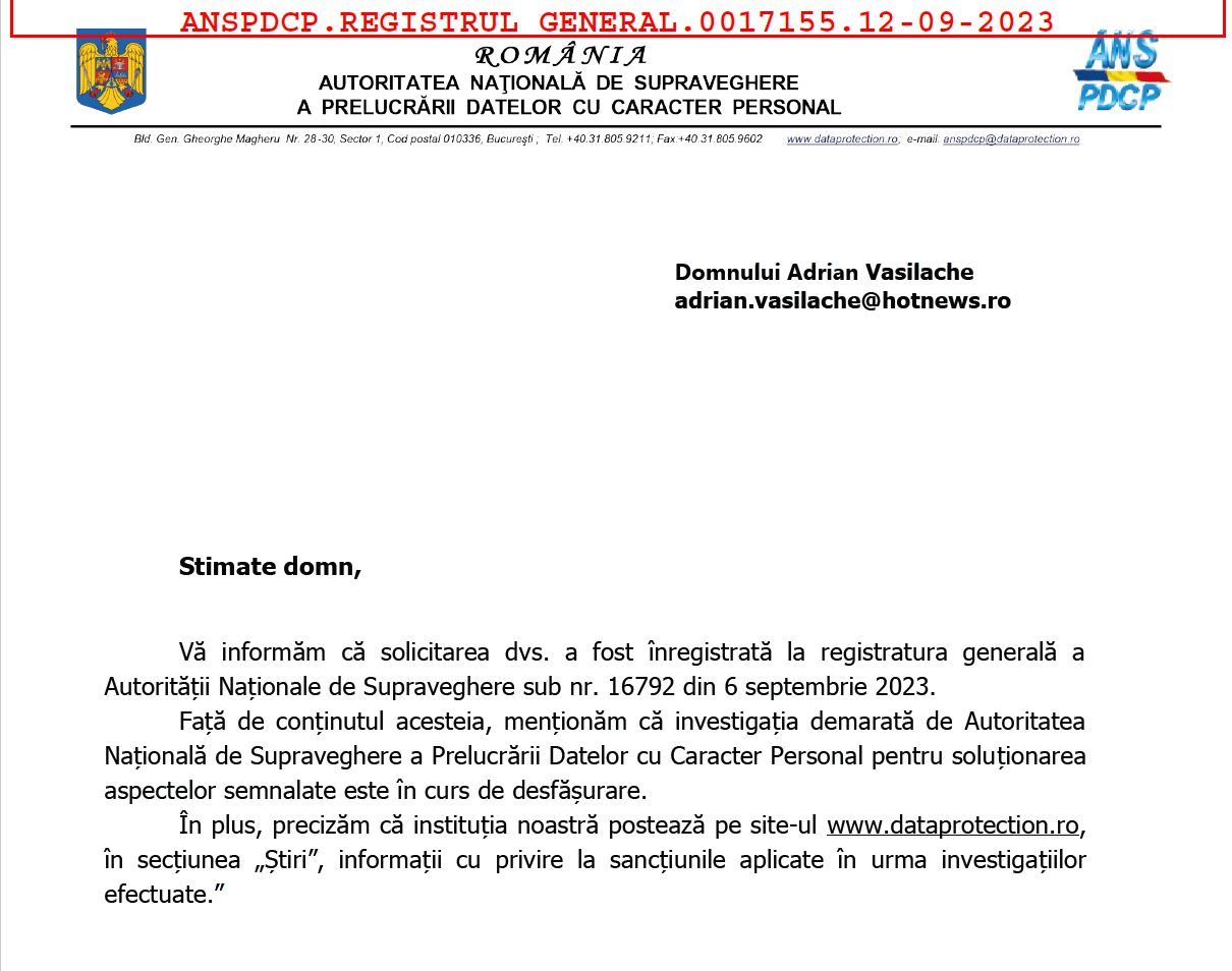 În timp ce Ministerul Mediului aprecizază că s-a încălcat GDPR și a notificat autoritatea pentru protecția datelor, ANSPDCP susține că încă investighează.