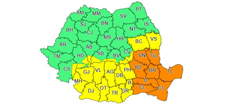 În intervalul menționat în județele Vrancea, Galați, Buzău, Brăila, Ialomița, Călărași, Tulcea și Constanța va ninge și va fi viscol. Vântul va avea intensificări susținute cu rafale de 75…85 km/h, iar vizibilitatea va scădea sub 50 m.