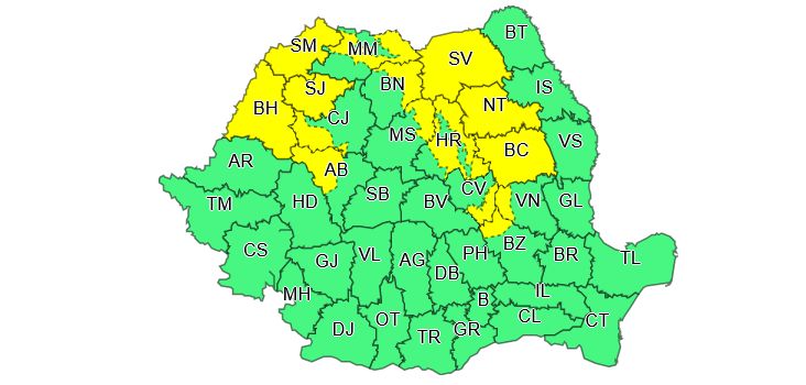 De vineri, ora 10, până duminică, ora 18, esta valabil un Cod Galben. Vântul va avea intensificări în Carpații Orientali și în Munții Apuseni cu viteze de 60…80 km/h, iar în zona înaltă, rafalele vor depăși 90…100 km/h. Îndeosebi în masivele montane din nordul țării, temporar va ninge viscolit, iar vizibilitatea va fi redusă.